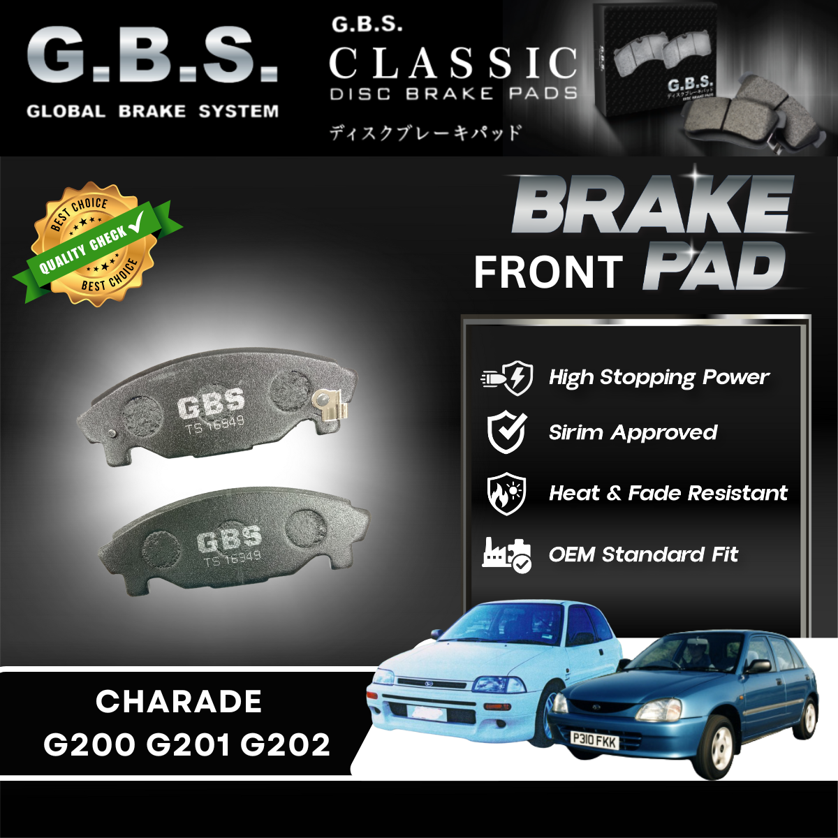 DAIHATSU CHARADE ESPRI G200 , G202 1.3 , PYZAR Front GBS Classic Brake Pad Brek Depan