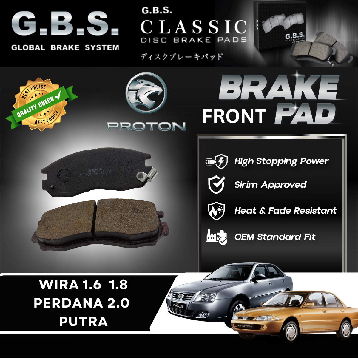 Proton Perdana Satria 1.6 1.8 GTI Wira 1.6, 1.8 Putra 1.8 GBS Classis Front Brake Pad Depan Brek