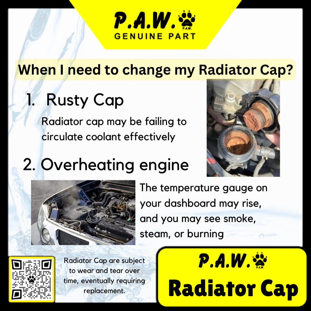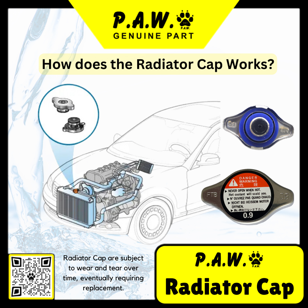 Radiator Cap is a high-pressure type that increases the pressure inside the radiator, thus raising the coolant boiling point and increasing cooling efficiency.