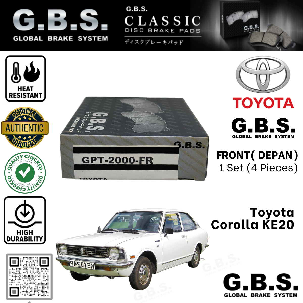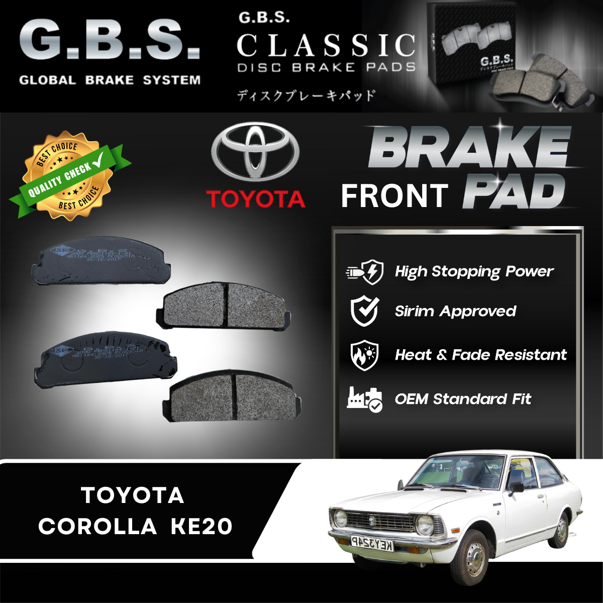 Toyota Corolla KE20 1972-1978 Depan Brek Pad GBS Classic Brake Pad Front Semi Metalic Sirim Approved